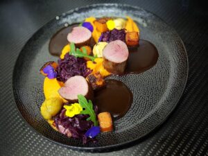 Pár darabot egyben hagyok és tetszőleges formára vágom, majd ugyanabban a serpenyőben ahol a hús sült, körbe pirítom tálaláskor. A sült gesztenyét szintén megfuttatom ugyanebben a serpenyőben.