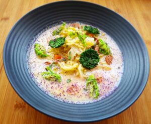 Pár levelet egy kis szódabikarbónás vízben blansíroztam, hogy későb egy kiszúróval kerek formákat kapjak és serpenyőben megpirítsam dísznek. Kellemes ízt ad és vagányul lehet vele a levest megdíszíteni.